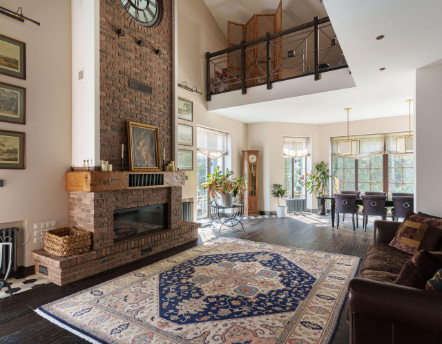 · В гостиной установлен камин, антикварная мебель, итальянские светильники, английский диван, стол из итальянских материалов. Красивая кухня выполнена из итальянских материалов, техника Smeg, Liebherr, Bosch. Два санузла с итальянской и немецкой сантехникой.