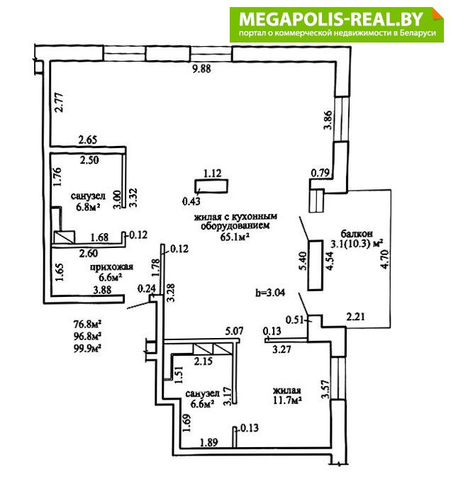 Общая площадь по СНБ 99,9 м2, общая площадь 96,8 м2, жилая площадь 76,8 м2.