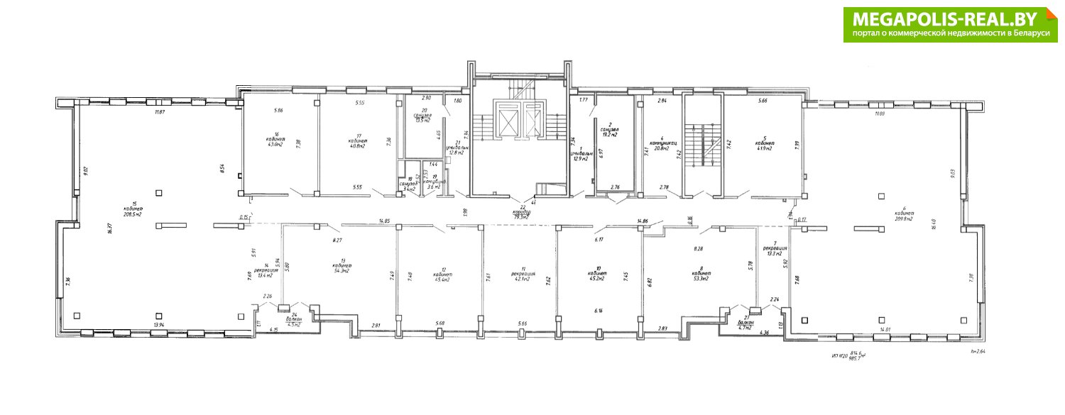 Офис кабинетного формата находится на 3-м этаже общей площадью - 985,7 м2 + помещение кухни - 67 м2 и склада - 81,8 м2 расположенные на -1-м этаже в Бизнес-центра.