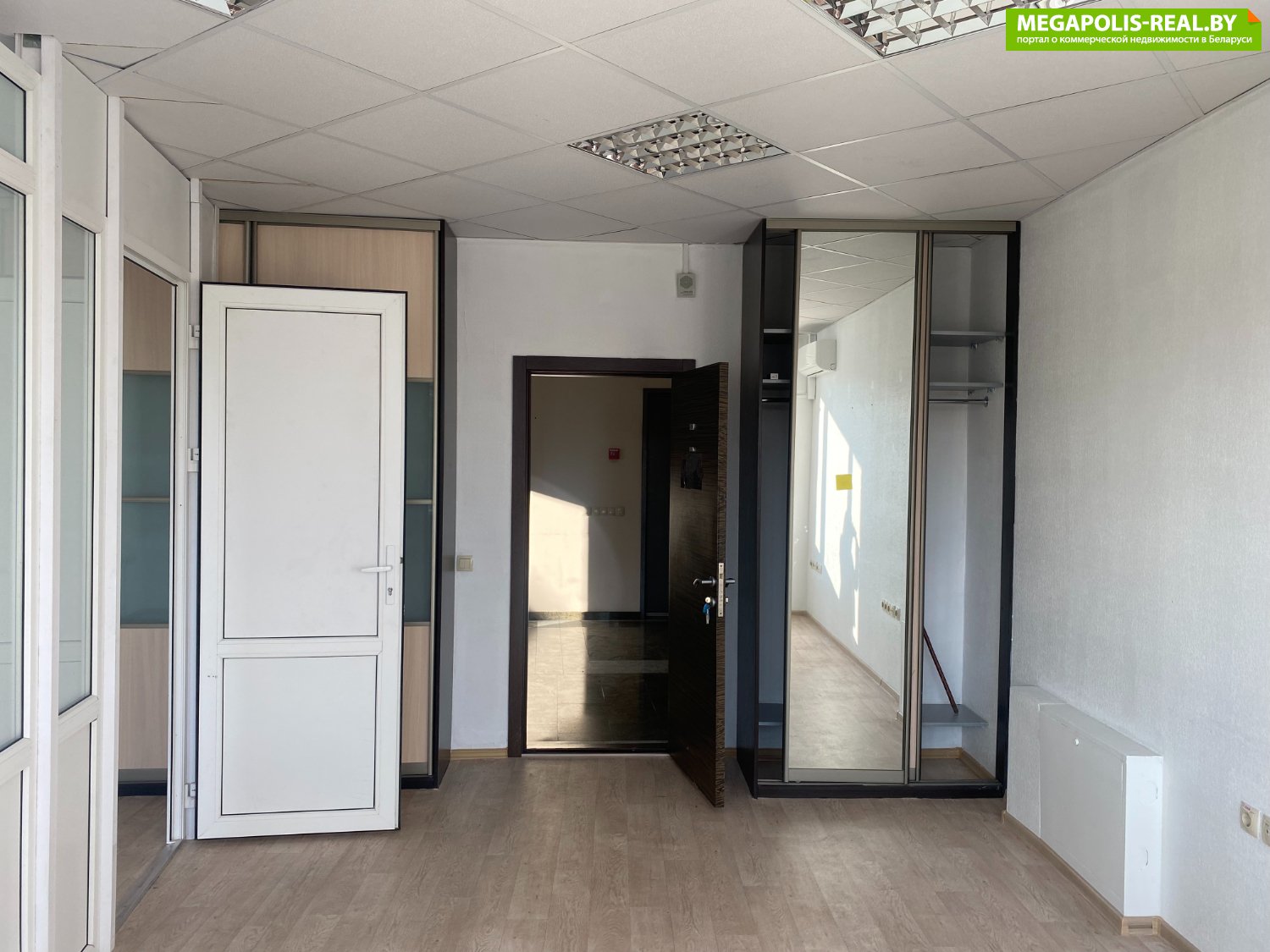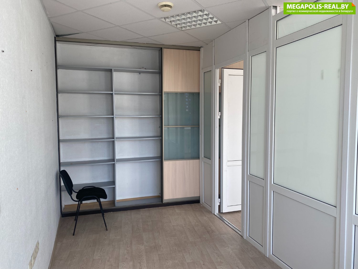 Формат — кабинетная нарезка: внутри установлена перегородка, разделяющая пространство на два отдельных кабинета. Это удобно для размещения нескольких сотрудников и обеспечивает гибкое зонирование пространства благодаря внутренней перегородке.