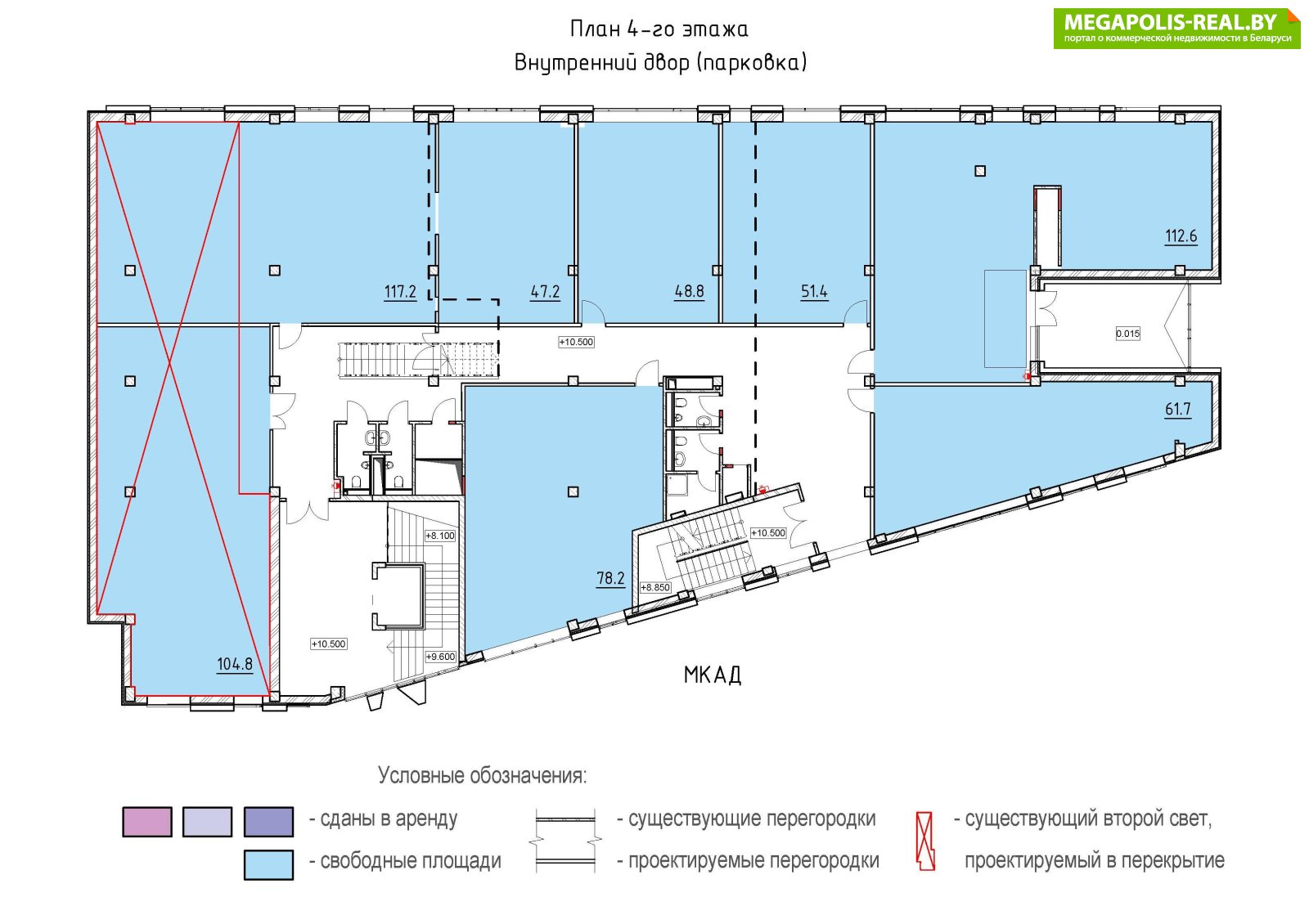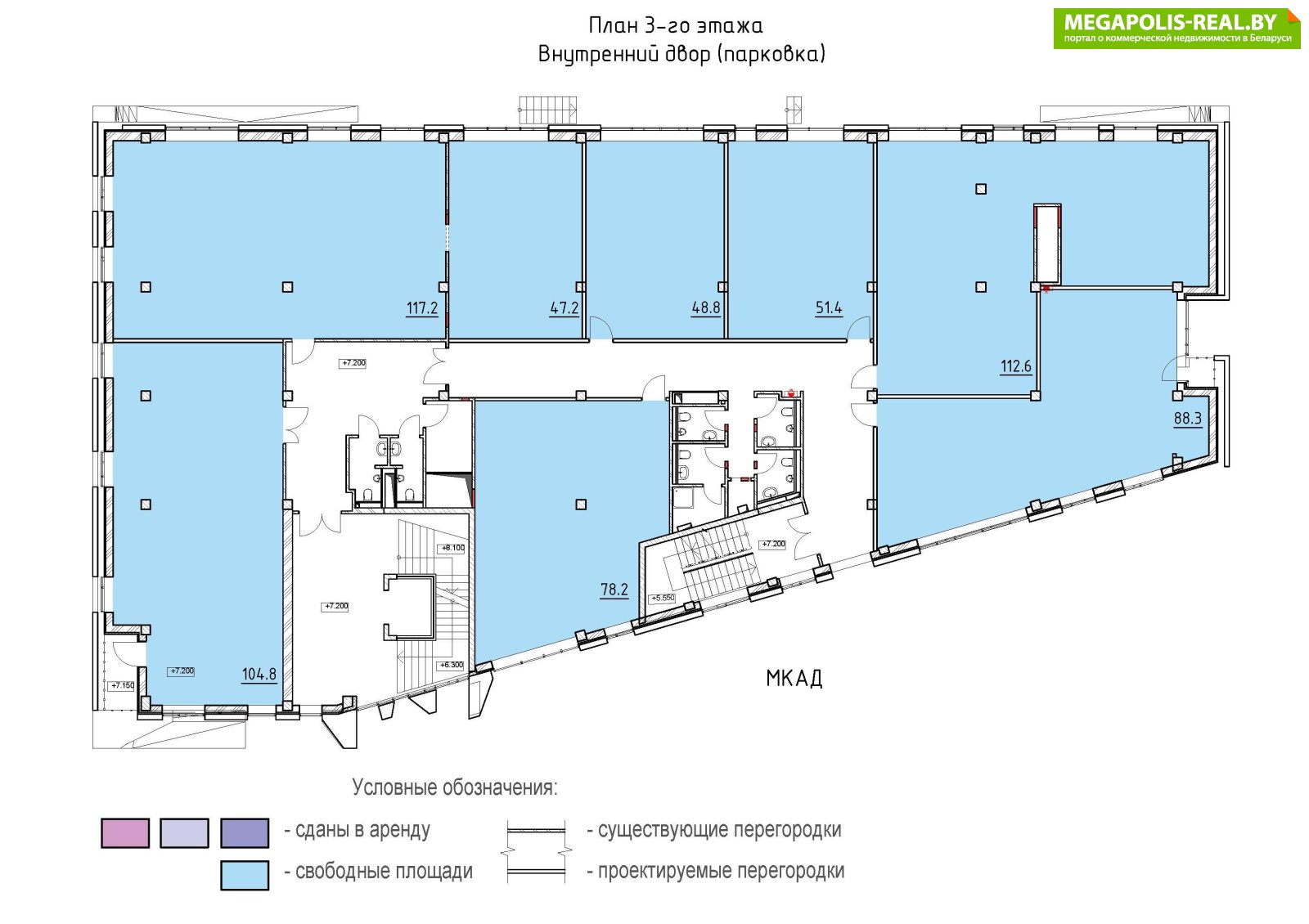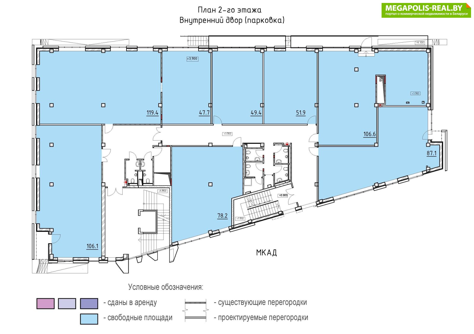 2 этаж: офисные помещения - 32,5 м2; 46,3 м2; 46,7 м2; 49,1 м2; 51,8 м2; 54,6 м2; 72,2 м2.3 этаж: офисные помещения - 28,8 м2; 38,3 м2; 40,5 м2; 46,6 м2; 47,3 м2; 51,8 м2; 72,2 м2.4 этаж: офисные помещения - 50,7 м2; 51,8 м2; 63,9 м2.