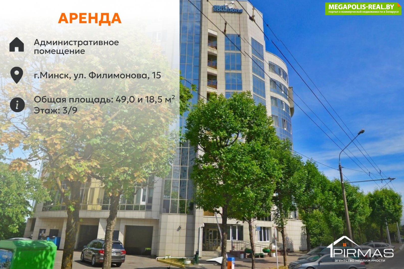 Сдаются в аренду два смежных офисных помещения общей площадью 67,5 м2 (18,5 м2 и 49,0 м2) на 3-м этаже делового бизнес-центра «Флагман», расположенного по адресу: г. Минск, ул. Филимонова, 15.