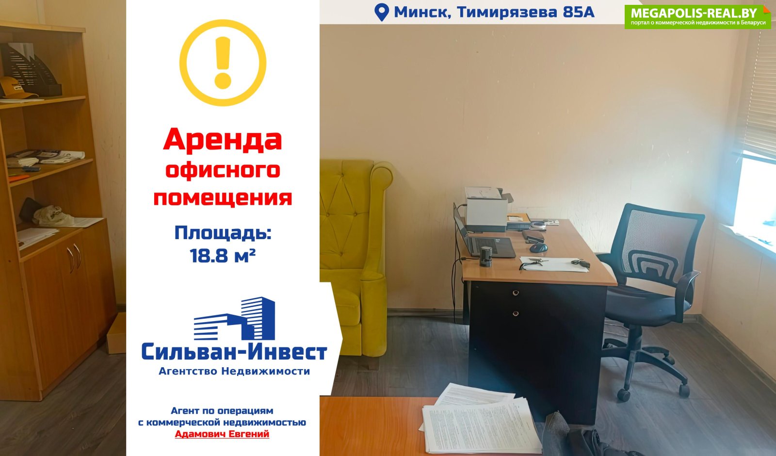АрендаСтатус объекта - офисАдрес: Минск, Тимирязева 85АПлощадь - 18,8 м2Сдается в аренду офисное помещение на 2 этаже в хорошем месторасположении.· помещение сдается в аренду с 01.11.25г.· к аренде добавляется +5 м2 общих помещенийПреимущества:· доступ 24/7· все условия для работы· огороженная территория· возможность на территории поставить свой контейнер· два парковочных места на стоянке· отдельный счетчик электричества· общий с/у на этажеАрендатор не оплачивает услуги риэлтерской организации!Ваш агент - Адамович Евгений.Больше предложений на САЙТЕ