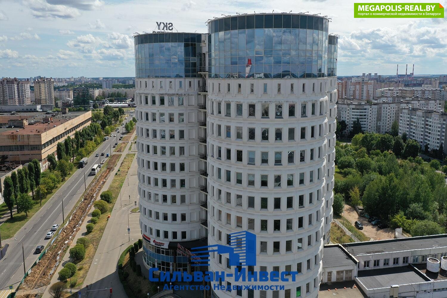 Современный 13-этажный бизнес-центр «Sky Towers» («Скай Тауэр») класса «В» располагает на первых этажах зоной Reception, кафе, а остальные этажи отданы под офисы со свободной планировкой. Площадь здания 21000м2.