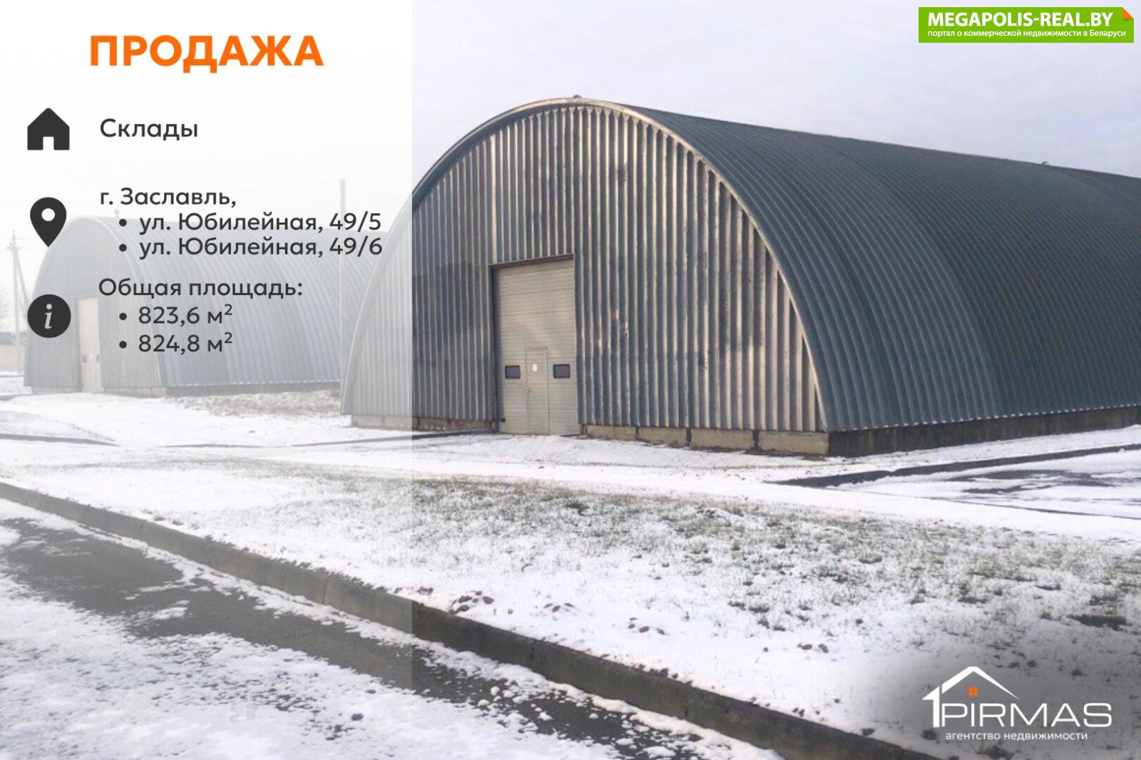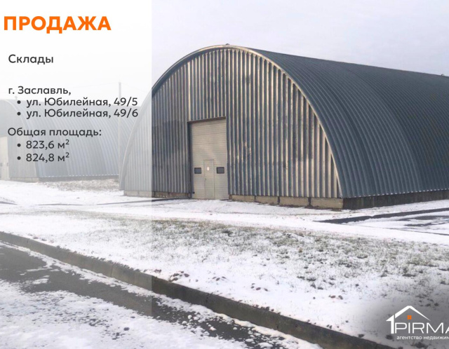 ► В продаже два склада, реализуются одним лотом○ Адреса: г. Заславль, ул. Юбилейная, 49/5 и 49/6○ Площади: 824,8 кв.м и 823,6 кв.м○ Тип зданий: арочные складские сооружения○ Бетонный пол — рассчитан на интенсивную эксплуатацию○ Коммуникации: электричество 380В, водоснабжение○ Удобный подъезд рядом со въездом в производственно-складской комплекс○ Асфальтированные подъездные пути для грузового транспорта○ Расположение непосредственно у трассы Р28 (Минск — Молодечно)