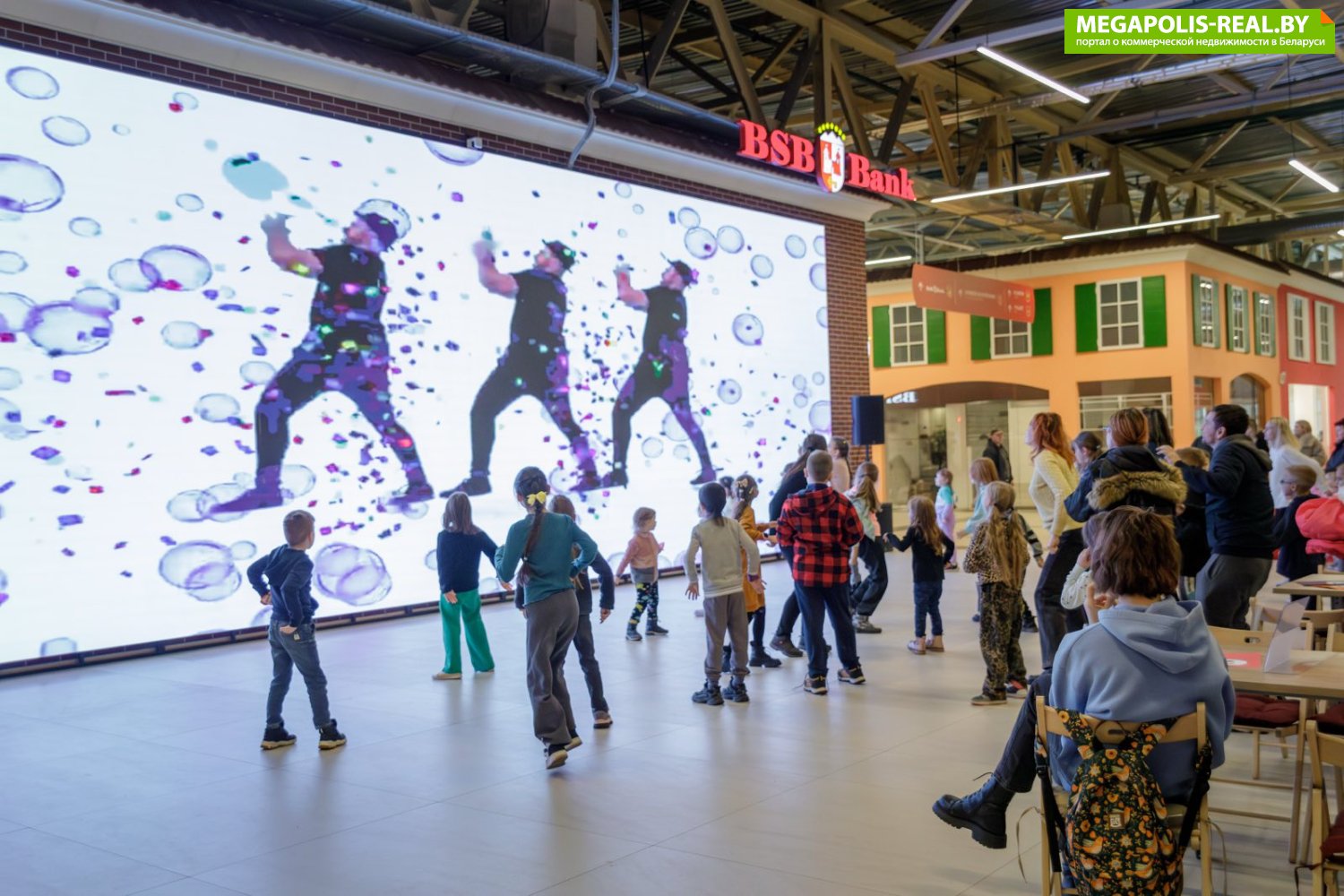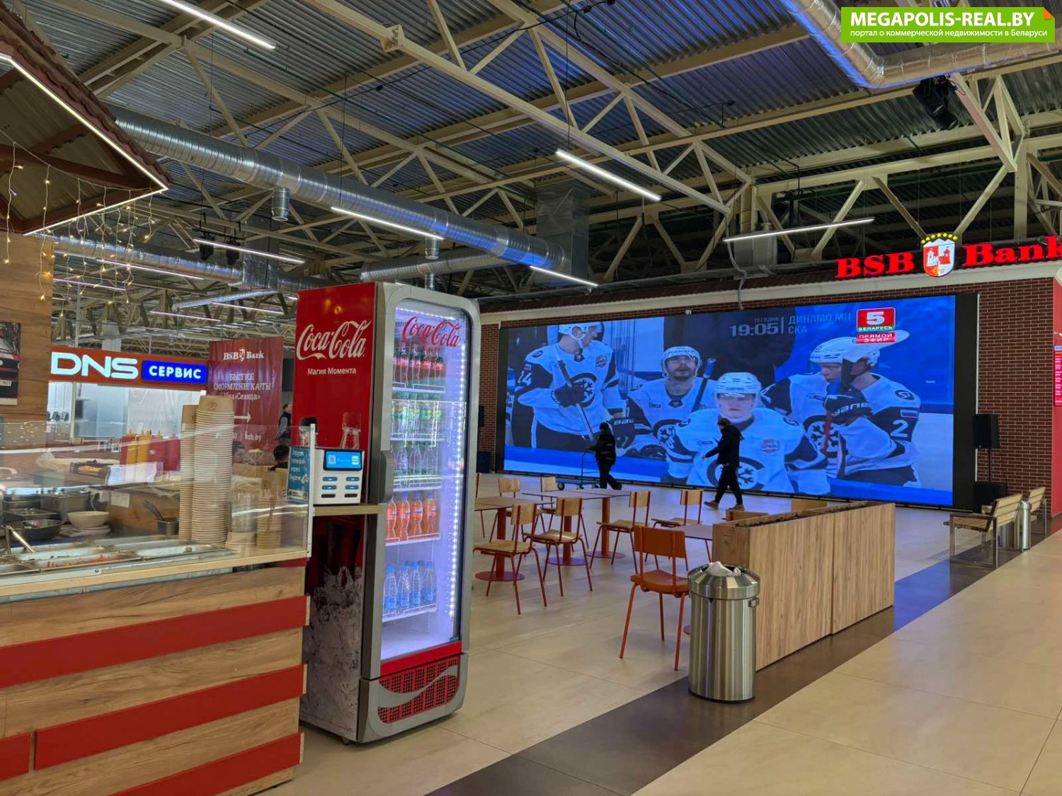 - Самый большой в Минске интерактивный экран прямо в зоне фуд-корта, трасляции спортивных мероприятий, фильмы, мультики