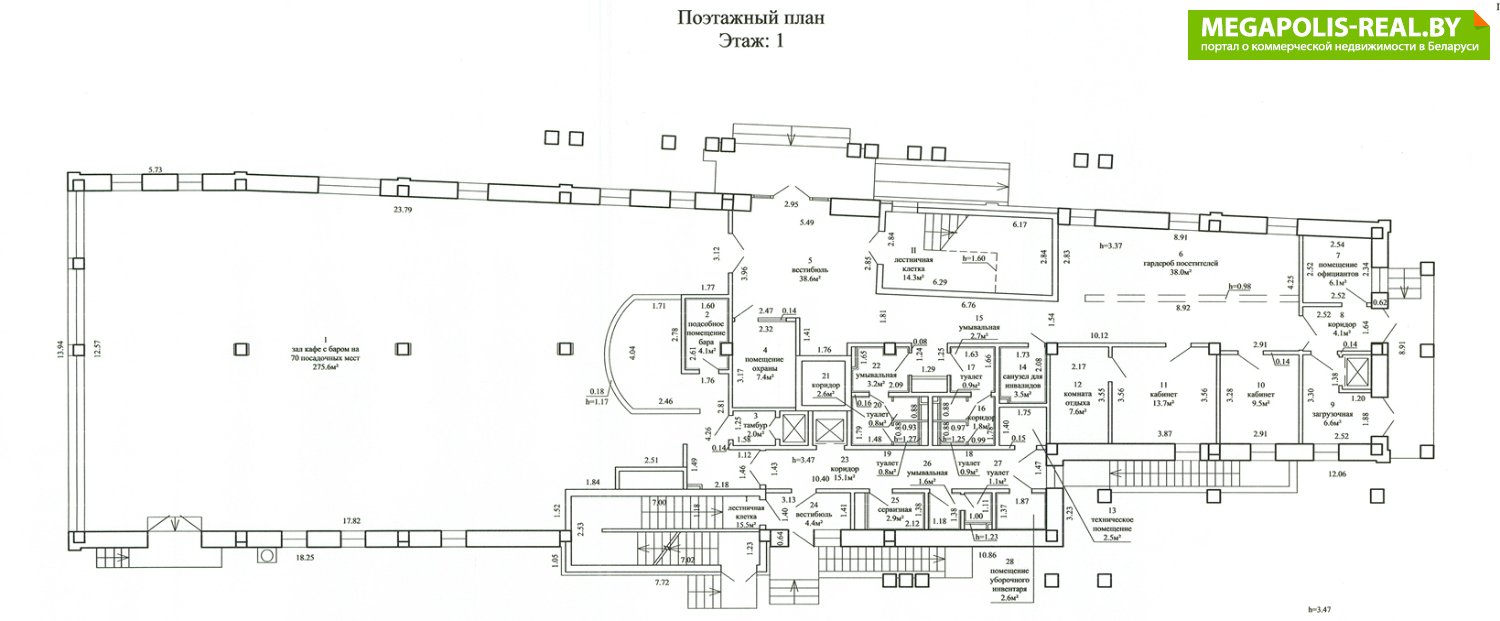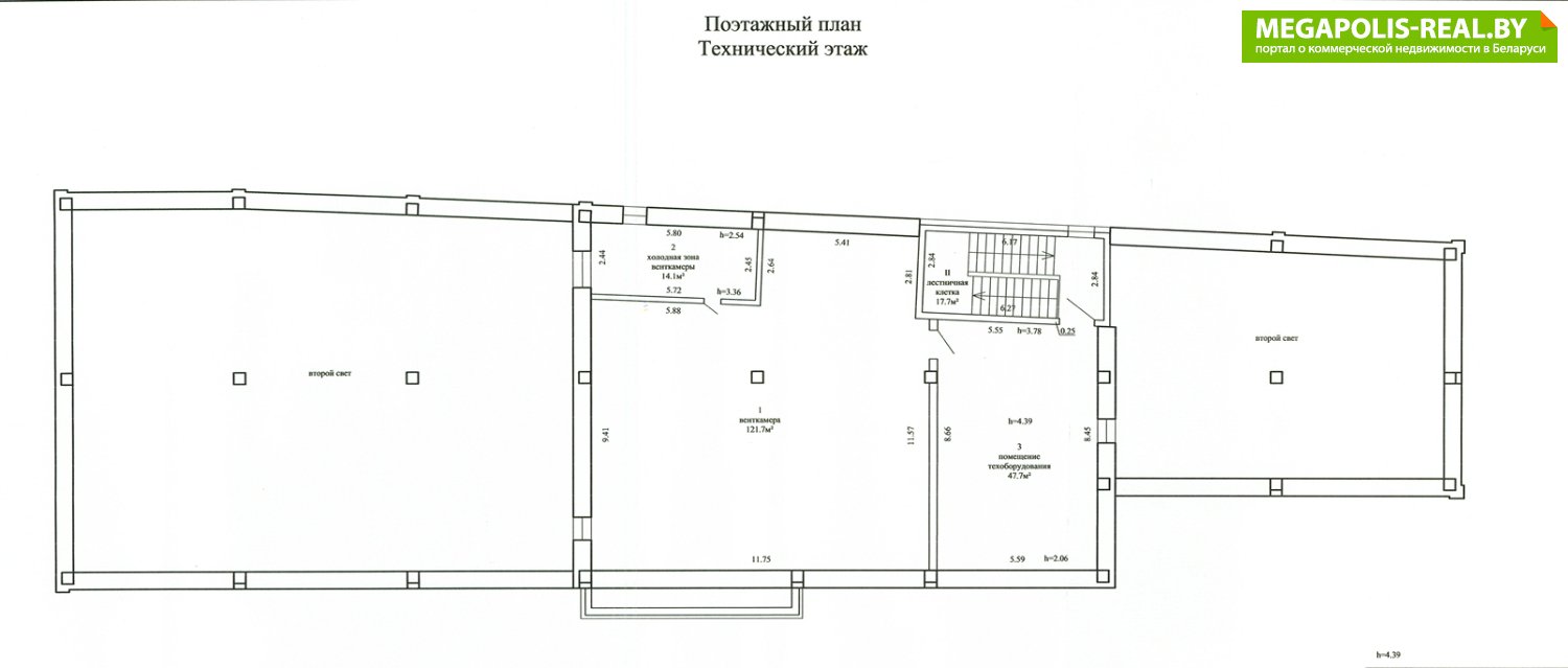 высота потолка 3,47м ; общая площадь этажа 500 м2