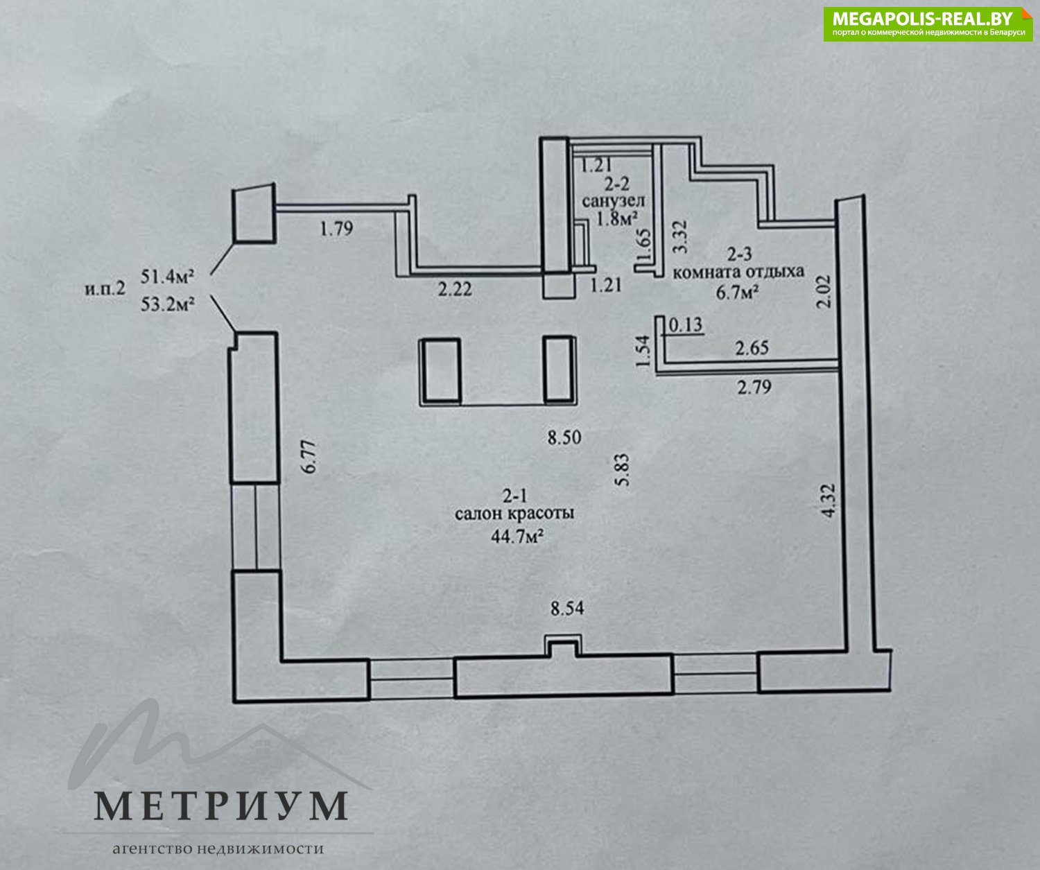 - Площадь: 53,2 кв. м, что позволяет удобно разместить рабочие места и зоны ожидания.