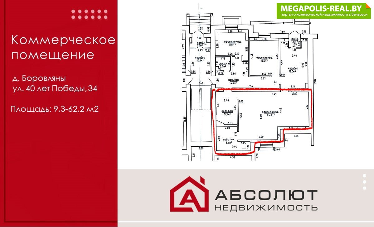 - помещение площадью – 9,3-62,2 м2,