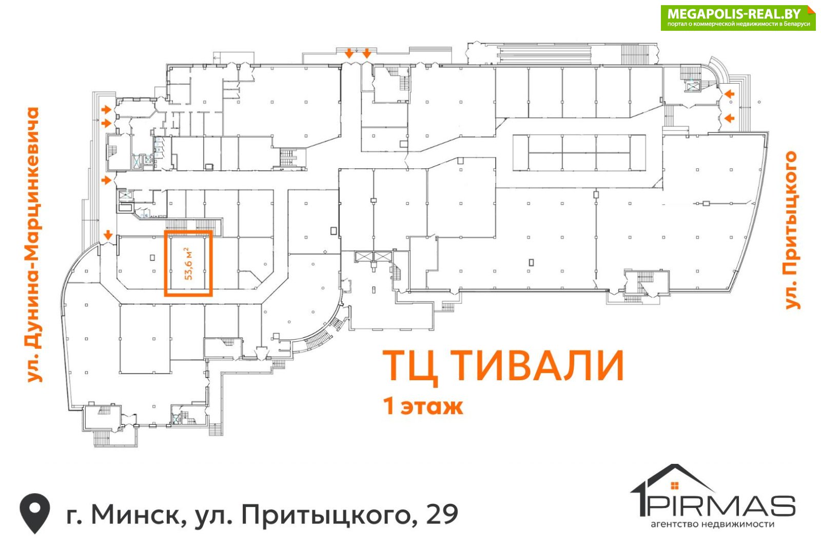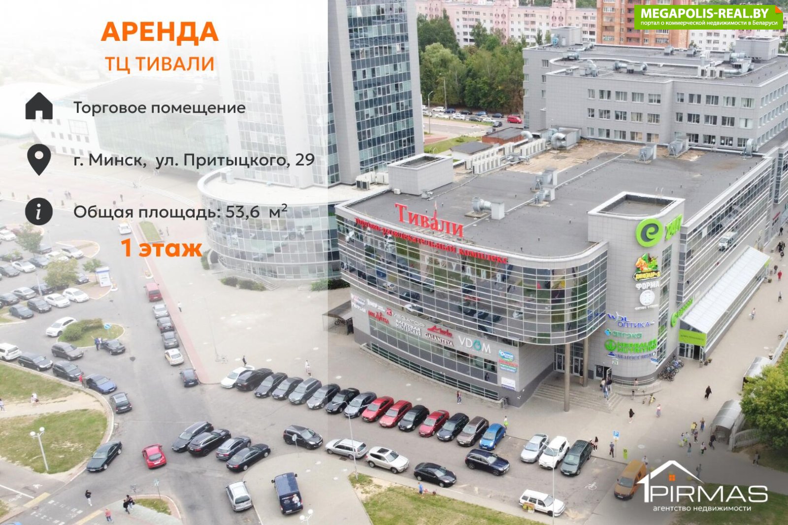 Сдаётся в аренду торговое помещение площадью 53,6 м2 на 1-м этаже торгово-развлекательного комплекса «Тивали» (г. Минск, ул. Притыцкого, 29).Расположено рядом с входом со стороны ул. Дунина-Марцинкевича — высокая видимость и удобство для клиентов.Локация с проверенным трафиком и готовой инфраструктурой.