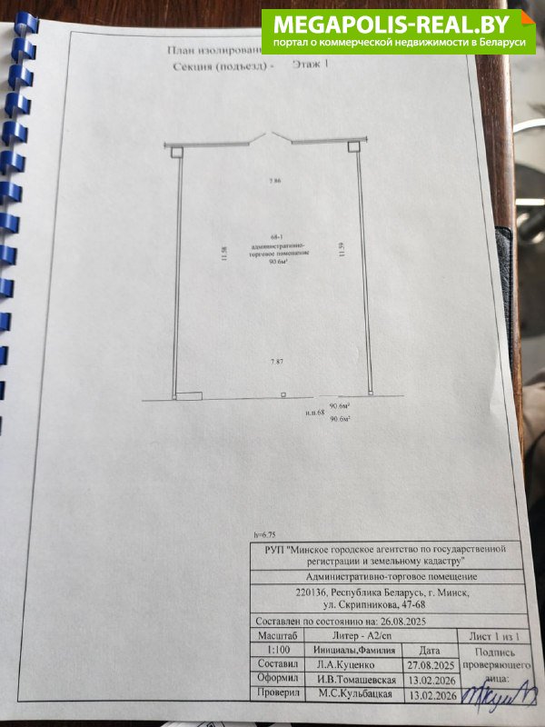 Торговое помещение расположено на первом этаже в торговом центре «4 СЕЗОНА» по адресу: г. Минск, ул. Скрипникова, 47. Современное здание 2025 года постройки.