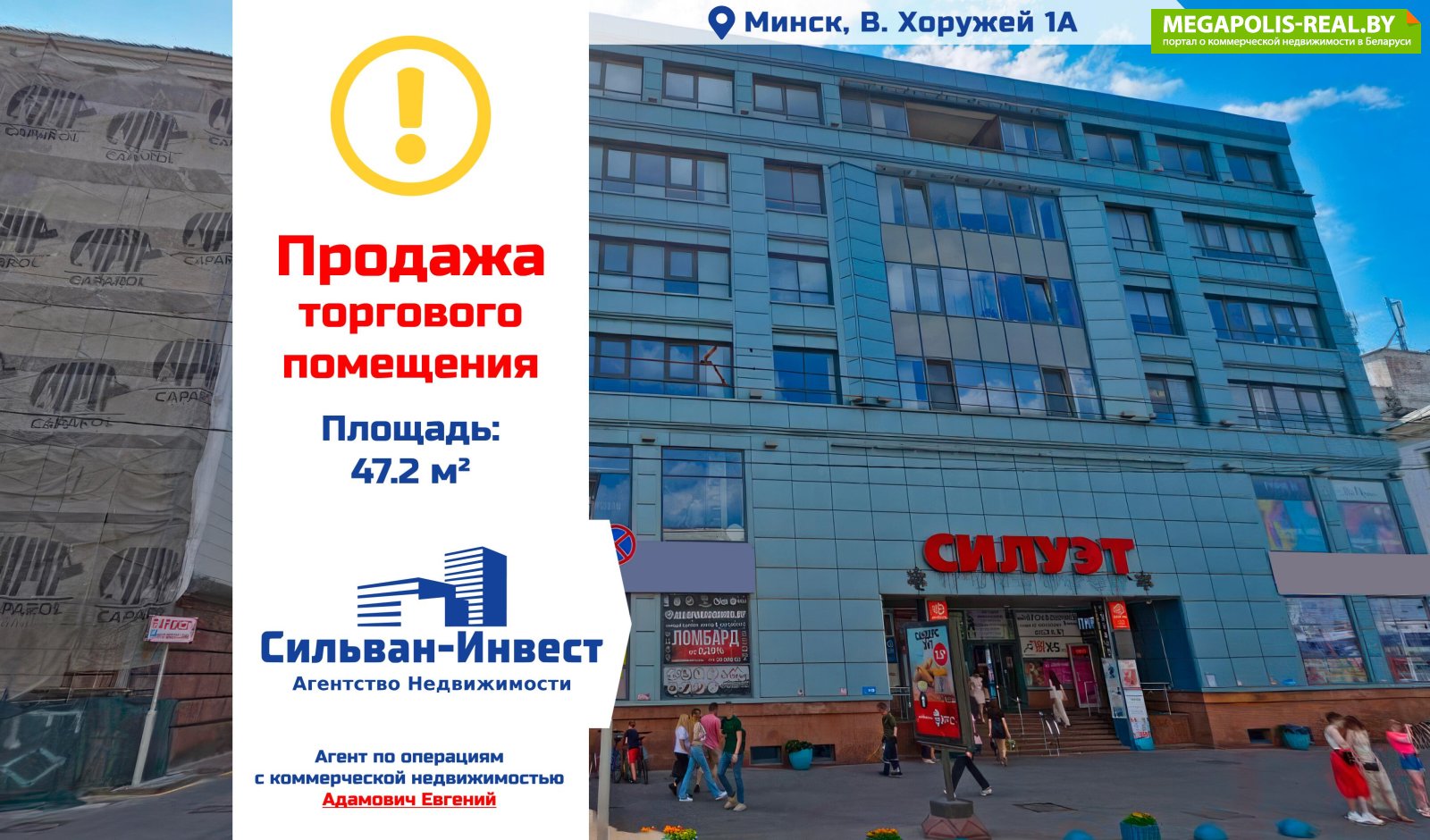 ПродажаСтатус объекта - торговое помещениеАдрес: Минск, В. Хоружей 1АПлощадь - 47,2 м2Продается торговое помещение в цокольном этаже ТЦ «Силуэт».Преимущества:· большая проходимость в ТЦ· все условия для работы· 150 метров до метро Я. Коласа· небольшая площадь торгового помещенияПокупатель не оплачивает услуги риэлтерской организации!Ваш агент - Адамович Евгений.Присоединяйтесь к нам в соцсетях:Договор № 25/3 от 14.05.2025г. до 13.05.2027г.ООО «Сильван-Инвест», УНП 192927433, лицензия №02240/383, Министерство юстиции РБ, 24.09.2019.