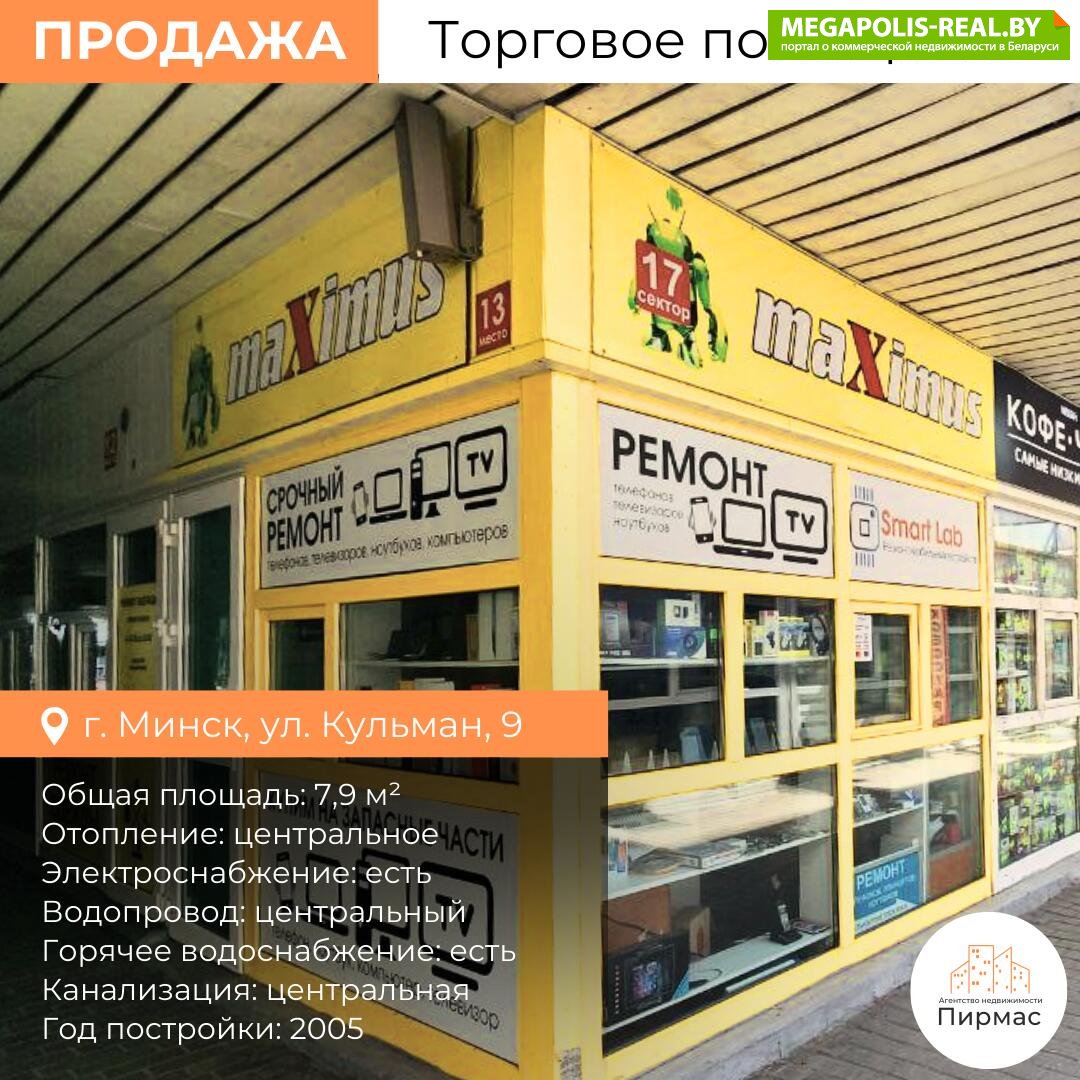 Адрес: г. Минск, ул. Кульман, 9 Назначение: торговое помещение Тип: павильон Этаж/этажность: 1/6 Общая площадь: 7,9 кв.м Вход: с улицы Расположение: угловое Стены и перегородки: кирпич, газосиликатные блоки, гипсокартон Полы: линолеум, плитка Окна: ПВХ стеклоблоки Отопление: центральное Электроснабжение: есть Водопровод: центральный Горячее водоснабжение: есть Канализация: центральная Телефон: каблирован Год постройки: 2005 ✅Преимущества объекта