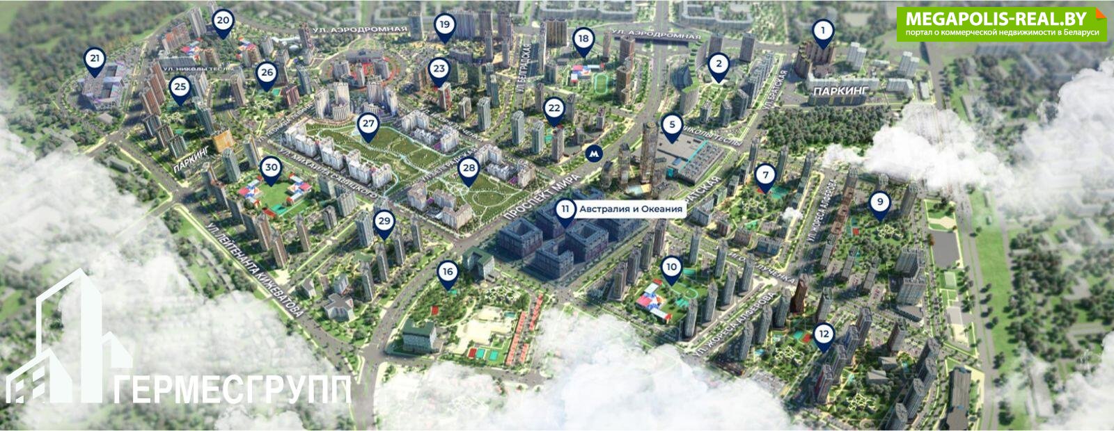 Жилой комплекс "Минск Мир" — это масштабный проект, реализуемый по принципу "город в городе", включающий 21 квартал, каждый из которых состоит из 10-12 современных домов, соединенных между собой. В комплексе предусмотрены все необходимые объекты социальной и коммерческой инфраструктуры: школы, детские сады, поликлиники, магазины, спортивные площадки, а также большой торгово-общественный центр "Авиа Молл".