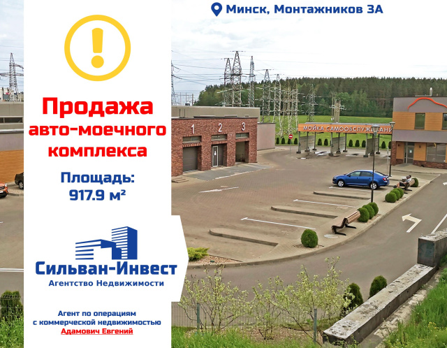 ПродажаСтатус объекта - услуги / торговый объектАдрес: Минск, Монтажников 3АПлощадь: 917,9 м2Продаётся самый крупный автомоечный комплекс Беларуси расположенный прямо на МКАД в районе ТЭЦ-4. В автомоечном комплексе 3 направления автомойки:· Скоростная тоннельная мойка без царапин на американском оборудовании Coleman Hanna. Пропускная способность составляет более 500 машин за рабочую смену· Ручная мойка· Мойка самообслуживанияПреимущества:· два отдельно стоящих здания· стабильный поток клиентов· пропускная способность 700+ машин за рабочую смену· близость МКАД· хорошие подъездные пути· участок 0,4133 га· специализированный штат сотрудниковПокупатель не оплачивает услуги риэлтерской организации!Ваш агент - Адамович Евгений.Присоединяйтесь к нам в соцсетях:Договор №16/3 от 25.06.2024 по 24.06.2026ООО «Сильван-Инвест», УНП 192927433, лицензия №02240/383, Министерство юстиции РБ, 24.09.2019.