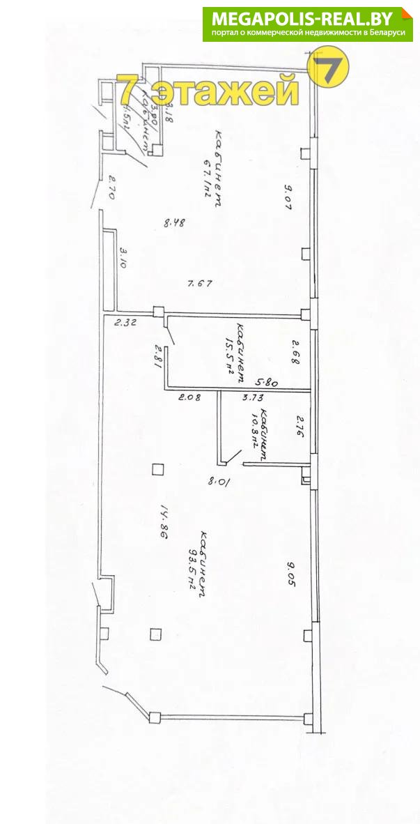 В настоящий момент имеются 4 отдельных кабинета (67,1 м2, 93,5 м2, 10.3 м2 и 15.5 м2), из которых два самые большие могут быть дополнены перегородками при необходимости реорганизации большого помещения в отдельные кабинеты меньшего размера. Также имеется серверное помещение оснащенное отдельным кондиционером. Правильно разведённая электрика даёт возможность одновременной бесперебойной работы большого количества офисной техники. При необходимость возможно заключить договор для возобновления работы сигнализации (вся проводка для этого есть). В помещении имеются два входа.
