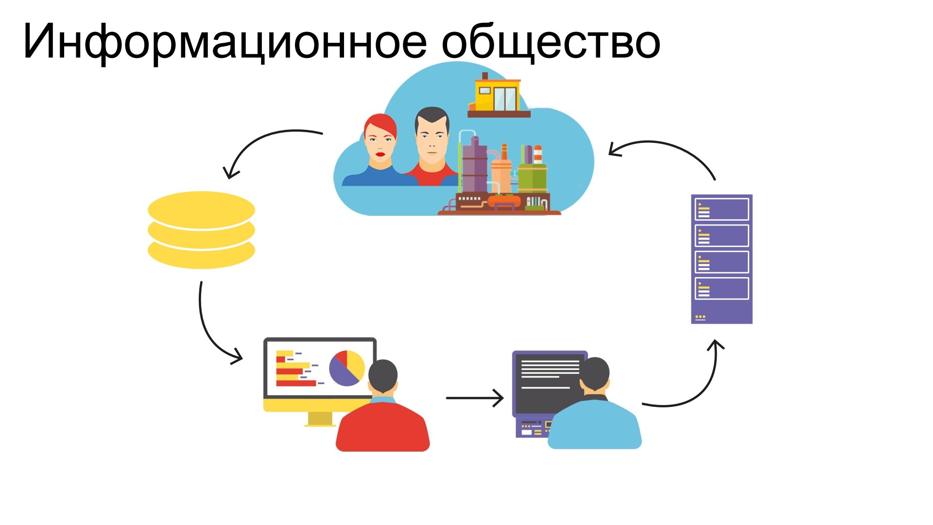 Идеальная картина информационного общества выглядит следующим образом: внешний мир генерирует огромный поток данных, которые поступает в компанию. Алгоритмы в режиме реального времени превращают эту информацию в человекочитаемый вид. Далее эту информацию обрабатывают программисты, дизайнеры, психологи, чтобы мы, прочитав ее, сгенерировали новые идеи. Эти идеи можно воплотить опять в некий код, который изменит, например, производственные процессы и тем самым повлияет на окружающий мир.